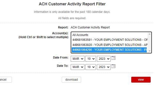 Select 449681063581 – YOUR EMPLOYMENT SOLUTIONS – OPERATING – View (do not adjust dates, the dates are automatically set to the prior business day, which is the most recent report we can see).