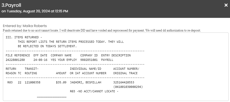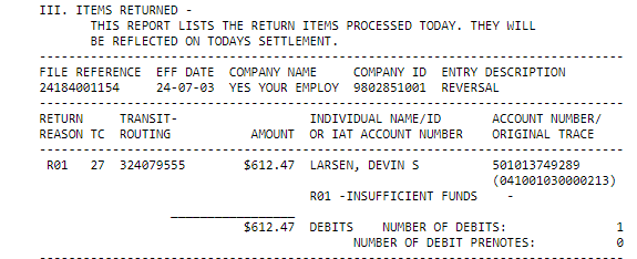 Reason: As listed on ACH Report